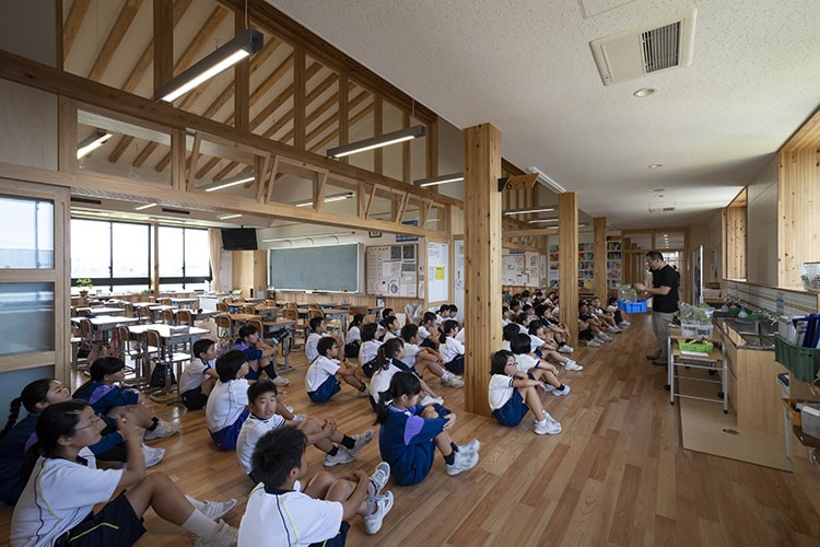 文部科学省による「木の学校づくり先導事業」による支援を受け、建築基準法の一部を改正する法律(平成27 年6 月4 日公布)、法第21 条及び27 条をふまえた全国初のオール木造3階建て校舎です。①「全国の木造3階建て校舎のプロトタイプを目指すこと」②「地域産木材を適材適所使用し森への還元を目指すこと」③「多層木造でも実現できる良質な学習環境を目指すこと」④「木造校舎を教材とした木育を根付かせること」を目標に掲げ、防耐火・木構造・音環境・温熱環境・木材調達・木育、各分野の課題解決も合わせて設計を進めました。設計・施工段階では竣工後も見据え、地域住民・教職員・児童を対象に木育教育につながるワークショップを行い、児童の校舎への愛着を育みながら進めました。