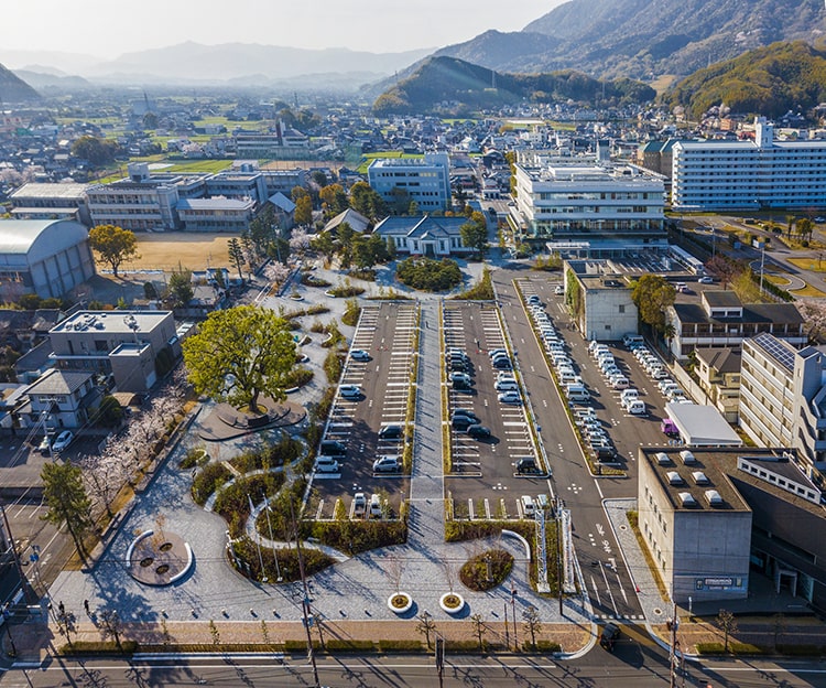 計画建物は国の重要文化財に隣接して建つ、市庁舎と図書館の複合施設です。多くの市民利用が想定される市庁舎の市民サービス機能を1階に、図書館を2階に配置し、それぞれをつなぐ吹抜けを設けるなど、積極的な相互利用を促す計画としています。また、来庁者のほか、市職員の資料調査やリフレッシュなどの日常的な図書館利用が可能となるため、市庁舎の執務環境の向上にも寄与しています。2階図書館に面する屋外テラス空間である「ステップガーデン」からは、周囲の風景を眺めながら読書やランチを楽しめる他、外部からも利用できる計画とすることで、2階図書館へのアプローチ空間や建物が建つ公園の施設としても利用できる計画としています。