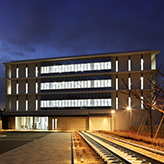 吹田の地に昭和18年に開設され、現在につづく歴史深い社員研修センターの老朽化した各施設のリニューアル計画。建物は中庭を囲う形の回廊でつながり、施設群の中で自身の所在が分かりやすく利用しやすい配置計画となっています。奥深い施設平面に対し各所に屋上緑化や光溢れるボイドを設け、階段やリフレッシュコーナーなど明るい共用空間を形成し、研修生同士の交流促進を期待します。本館・実習棟の東西面には外観上の特徴となる日射抑制の為の縦ルーバーを設け、研修室環境の向上を図っています。中庭に開かれた厚生棟の食堂はウッドデッキ越しの水景や四季折々の表情を魅せる緑化空間と視覚的につながり、日々の研修の疲れを癒すリフレッシュ空間を形成しています。