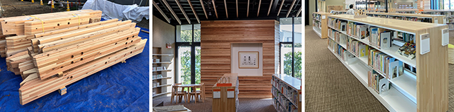 設計初期段階で森林組合へヒアリングを行い、供給可能な木材量を最大限活用した上で、隣接市で加工可能な種別・部材寸法を選択する方針としています。豊富なスギを構造材(集成材)や内装材(製材)に、ヒノキを建具・家具類(集成材)に使い分け、目に映る全ての木部を香美市産材+県内加工で実現しました。