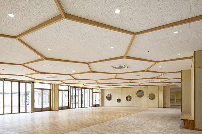 垂直移動を少なくし、横方向への広がりを持たせた2階建てのボリュームは水平ラインを強調した伸びやかなデザインとし、分節化することにより子どものスケール感に近づけました。
