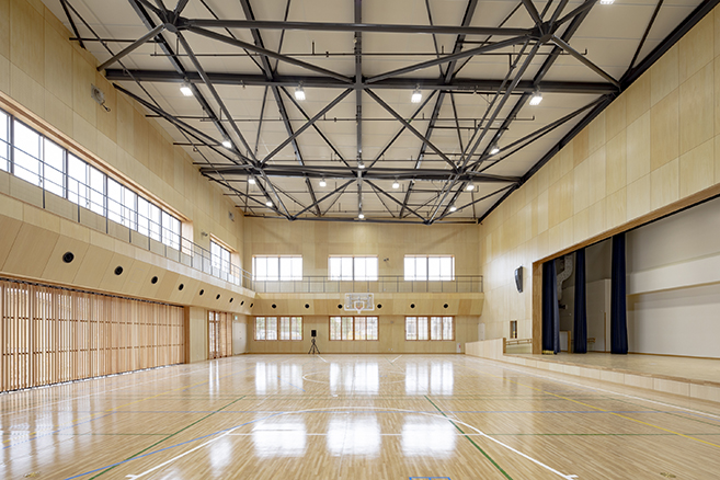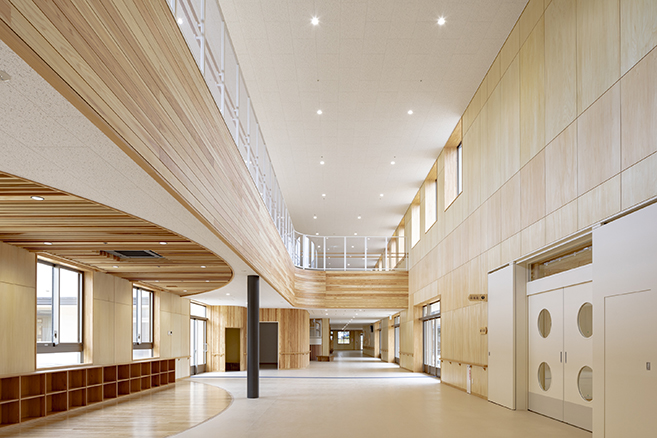 コミュニティモールを学校の動線の軸とし、そこから各教室へ移動する明快な動線計画と行き止まりがない回遊性を確保することにより、教職員の連携強化を図り、生徒児童が安心・安全に利用できる学校を目指しました。