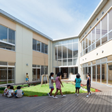 三重県中南部に位置する児童数250 名程の小学校の改築です。敷地は集落に囲まれた中心にあり、校門には門扉がありません。このような地域に抱かれた特徴を活かし、まちのアイデンティティとなり、まちと自然とつながる、相賀(あいが)ならではの学び舎づくりを目指しました。外観は校舎全体を包む大屋根に抱かれ、分節された各ボリュームがまちのスケール感に溶け込む構成としました。日本有数の多雨地帯に配慮し、軒のあるデザインとしています。また、グラウンドに沿ったリズミカルな列柱と深い軒のある路地・縁側空間は、まちを学校に引き込み、地域と学校の関係をより身近なものにします。配置計画は、一部残した既存校舎に対し、中庭を中心に新校舎をV字型に近接させました。これにより回遊性が生まれ、新旧校舎がコンパクトかつ一体的につながります。 内部は小規模校の特徴を活かし、各教室がゆるやかにつながり、学校全体をフルに活用できる空間構成としました。普通教室間の壁は可動式で教室自体の大きさ・形状を可変でき、クラス数や学習形態の変化に柔軟に対応します。既存校舎は躯体のみを残し、教室配置を含めて内外装を全面改修し、新たな校舎として蘇りました。 また、オープンな空間構成や深い軒のある半屋外空間など、屋内外を豊かにつなげるとともに、内装や軒天、縁側などには地場産桧材を多用し、木の温もりのある空間づくりを心がけています。
